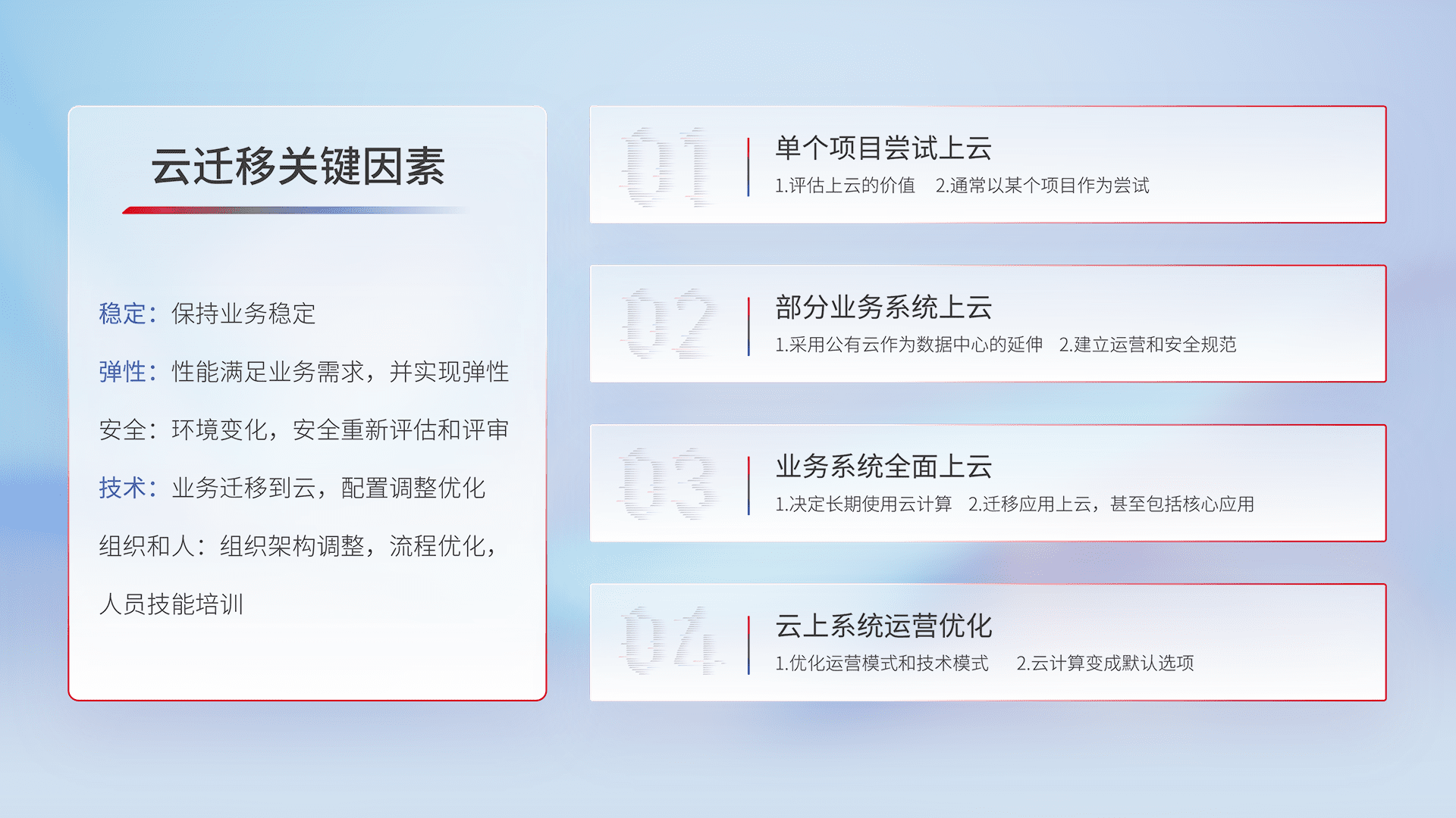 结合实际业务,,,,从规划设计、、、云平台选型、、云原生改造、、、、数据迁移、、、集成交付,,,迁移全过程为客户识别最佳上云路径,,,做好风险识别管理,,,,设计网络架构、、身份权限、、、安全审计合规、、操作审计、、、日志审计、、、、监控告警策略、、多站点容灾设计等,,,对云上基础设施进行整体规划,,提升IT治理水平,,,,以满足弹性、、高可用、、、高性能的需求。。。。