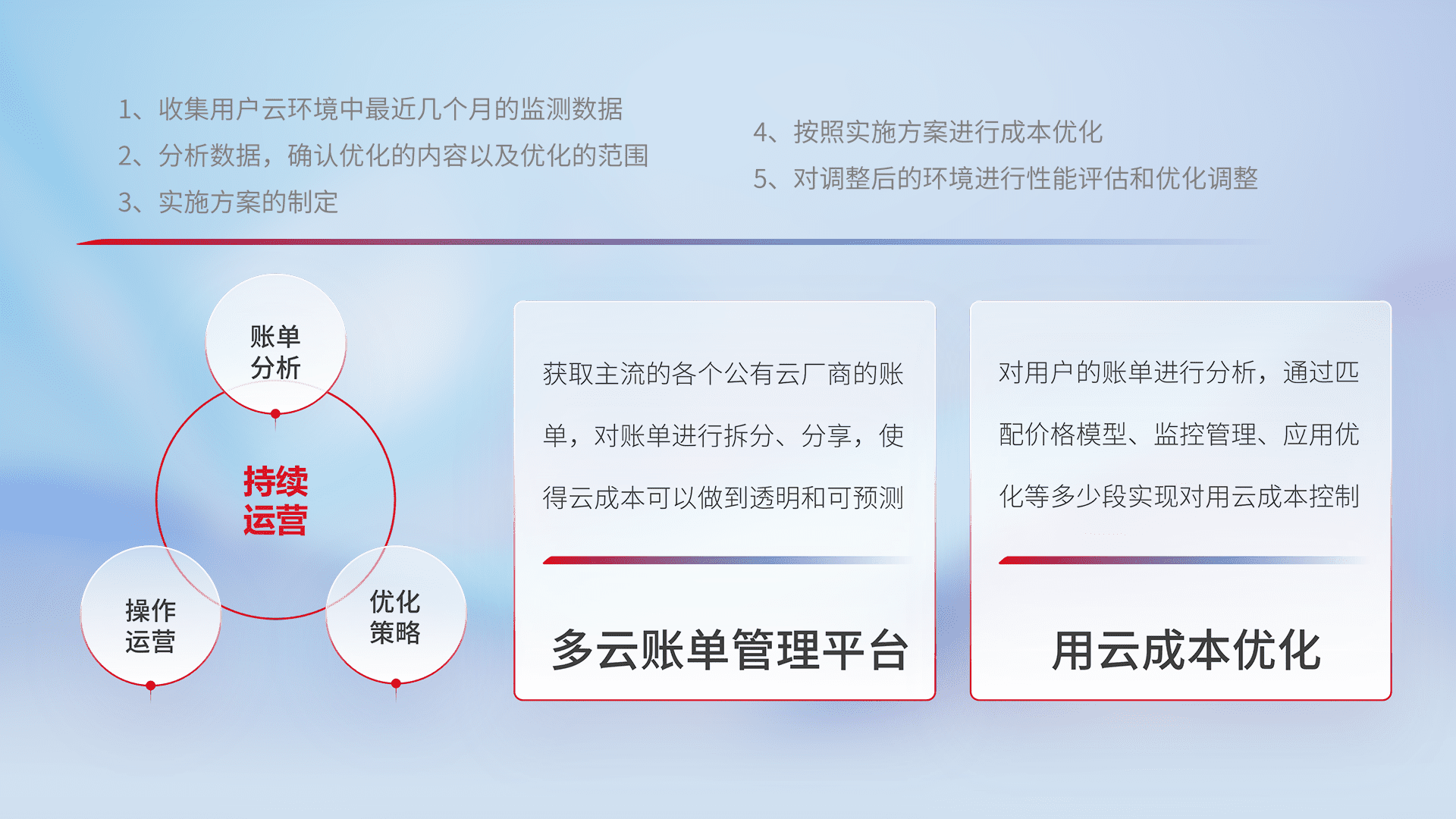 通过多云纳管,,,以统一的资源数据模型把客户的云资源进行抽象和封装,,,进而实现对多云资源的统一操作,,,保障云资源管理的可靠性、、、、稳定性与可用性。。量身定制化运维内容,,配置、、开发运维、、、补丁管理、、、、备份、、监控、、认证和访问管理、、、、审计和日常巡检等,,保障在用云过程中的可靠度,,,稳定度以及高可用率。。。
